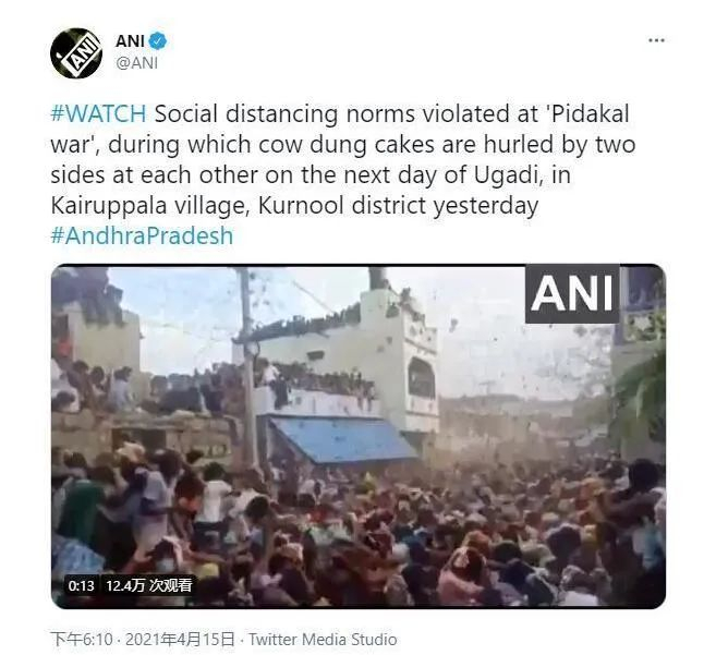 据印度新德里电视台(NDTV) 15日报道,在印度正在努力应对致命的第二波新冠疫情之际,印度安得拉邦库诺尔区(Kurnool)的大量民众却无视防疫规定,在未佩戴口罩的情况下聚集在一起庆祝乌加迪节(Ugadi)。乌加迪节是印度卡纳塔克邦、安得拉邦和泰伦加纳邦新年的第一天。