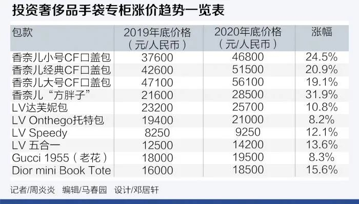 LV、Dior、Gucci也不例外,下图是一些热门包款2019年底和2020年底价格的对照。