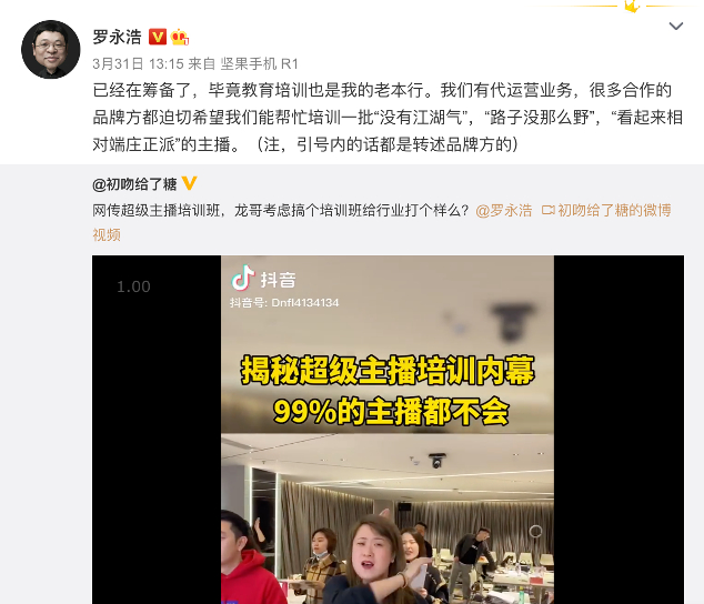 “培训未动,营销先行”。老罗转发回复称“已经在筹备了,毕竟教育培训也是我的老本行。我们有代运营业务,很多合作的品牌方都迫切希望我们能帮忙培训一批‘没有江湖气’,‘路子没那么野’,‘看起来相对端庄正派’的主播。”