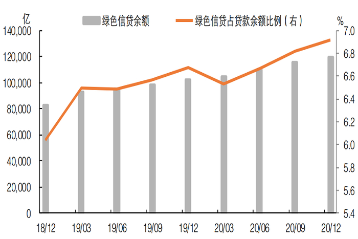 目前,我国已建立了多层次的绿色金融体系,在绿色融资中绿色信贷占据绝对主体。从存量看,2020年末中国绿色信贷余额近12万亿元,存量规模世界第一,占我国总贷款余额的6.9%;2020年末绿色债券存量8775亿元,虽位居世界第二,但仅占中国债券余额的0.8%。
