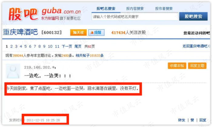 同年12月15日,在重庆啤酒经历了连续第6个“一”字跌停的晚上,一名东方财富股吧网友在重庆啤酒吧发表一篇题为《一边吃,一边哭!》的帖子。