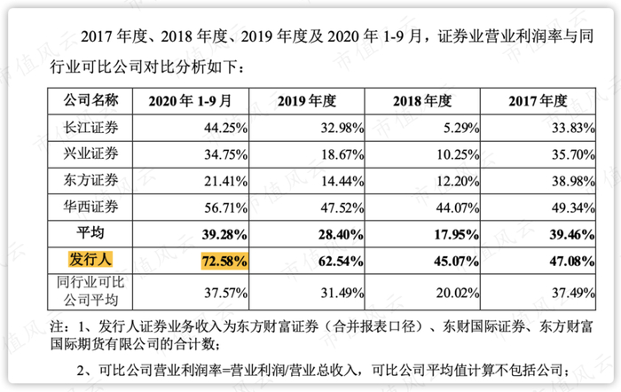 根据证券业协会2019年年度报告的证券业务排名(以经纪业务收入+融资融券业务收入来计),东方财富位列第19,其营业利润率大幅高于可比公司(排名17-21的公司)平均值。