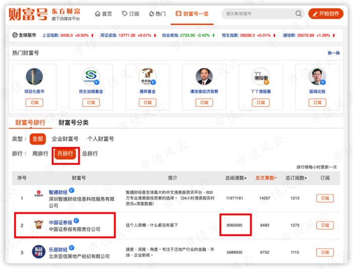以中国证券报财富号为例,其累计发文9483篇,近一个月内阅读806万次(截止3月29日)。