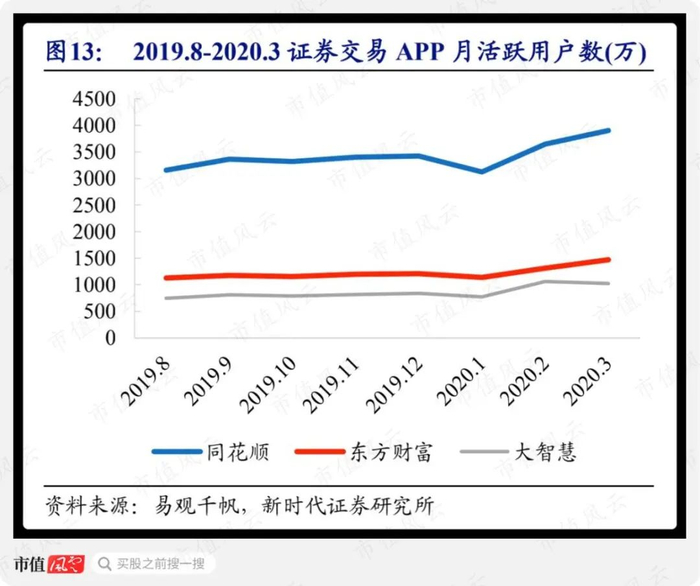易观千帆数据显示,2019年8月至2020年3月,东方财富app以1000-1500万的月活人数在证券交易app中位居第二,仅次于同花顺(300033.SZ)。