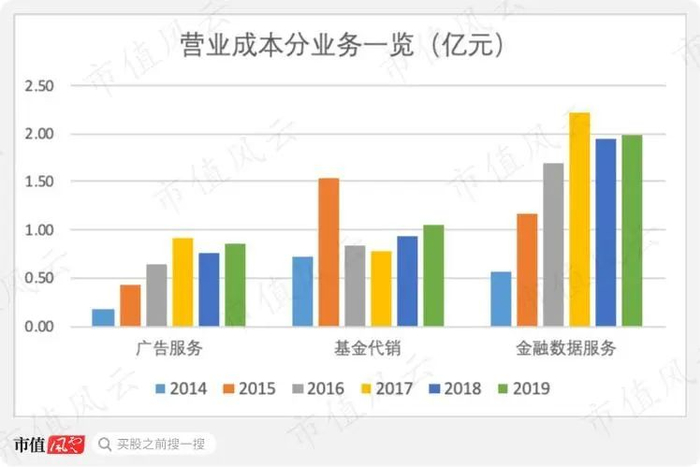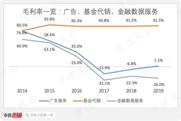 相比于基金代销高且稳定的毛利率,广告、金融数据服务的毛利率从2015年开始下滑:广告服务毛利率从2014年的79.4%下滑至2019年的1.1%,同期金融数据服务毛利率则从60.9%降至-26.0%。