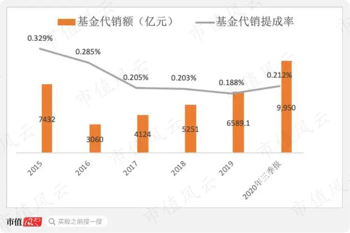 基金代销业务的竞争在互联网巨头(蚂蚁金服、微信理财通、京东金融)的涌入后更加激烈,天天基金的基金销售提成率逐步下降,从2015年的0.329%下降至2020年前三季度的0.212%。