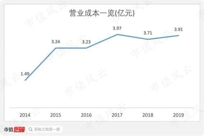 2016年后,营业成本增长幅度减缓,从2016年的3.23亿元升至2019年的3.91亿元,CAGR为6.58%。同期基金代销成本支出由0.84亿元升至1.06亿元,涉及到信息采集和服务器支出的金融数据服务成本则从1.69上升至1.99亿元。