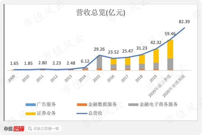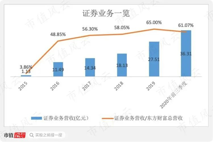 2020年前三季度证券业务实现营收36.31亿元,占东方财富总营收比例为61.07%,较2019年的65%有所下降。
