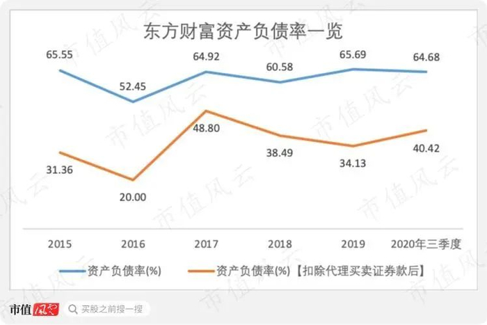 为了更加真实的考察东方财富的资产负债率,风云君将代理买卖证券款这个对公司不造成偿还压力的科目剔除,东方财富2020年三季度调整后的资产负债率仅有40.42%,真实负债水平较低。