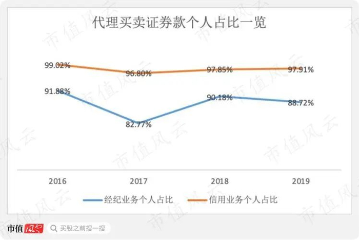 年末的代理买卖证券款金额显示,证券经纪业务买卖款个人占比在82%以上,2019年底达88.72%;以两融为绝对核心的信用业务个人占比一直在96%以上,2019年底达97.91%。