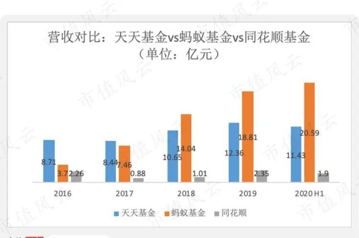 得益于支付宝app大量的用户基础,蚂蚁基金在2018年成为第三方基金代销的老大,营收从2016年的3.72亿元大增至2020年半年度的20.59亿元。