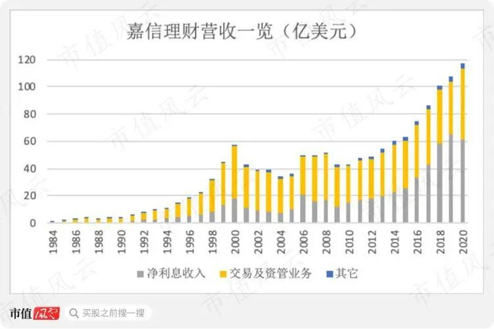 2020年末,嘉信理财负债端包含客户存款3580亿美元、其它应付款1042亿美元。同年嘉信理财净利息收入为61.13亿美元,超过了其交易及投行资管业务52.46亿美元的营收(其中交易账户净收益17.71亿、投行资管为34.75亿)。