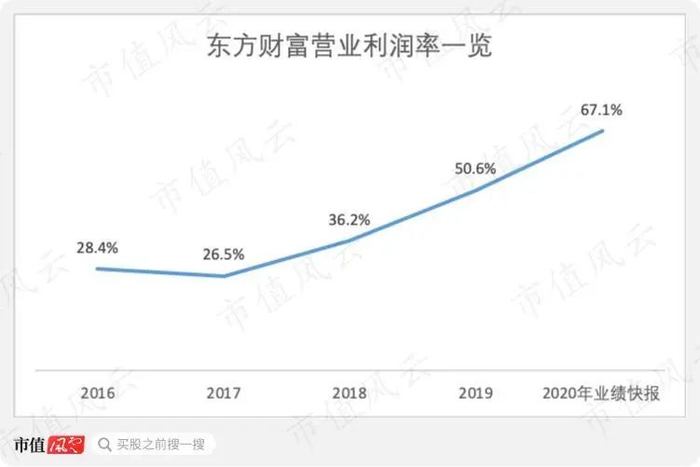 在证券营业利润率不断提高、基金业务保持高盈利下,东方财富总体营业利润率从2016年的28.4%上升至2020年业绩快报下的67.1%,提高了38.7个百分点。