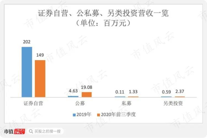 2020年前三季度,公司在证券自营投资、私募、另类投资三方面分别实现收入1.49亿元、133万元、237万元。