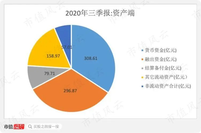 2020年三季报显示,东方财富账上拥有309亿元的货币资金、297亿元的融出资金、80亿元的结算备付金,流动资产占总资产93.7%。