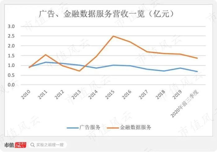 从2010年上市至今,广告、金融数据服务业务的营收均没有明显的增长,广告收入从2009年的0.56亿元到2019年的0.87亿元,同期金融数据服务从1.04亿元升至到1.58亿元。
