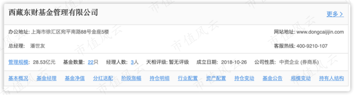 2019年12月3日,公司推出首只公募基金产品——东财上证50A(008240)。截止今年3月23日,西藏东财基金共有指数、混合权益类基金22只,总规模28.53亿元。