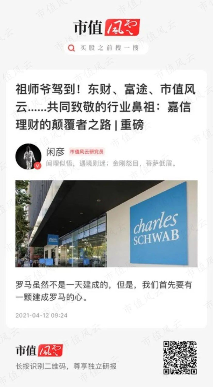 风云君已经推送了嘉信理财的独立研报,各位老铁尽可持续关注市值风云App,不断收获你很难得到的专业、客观、独立的第三方研报。