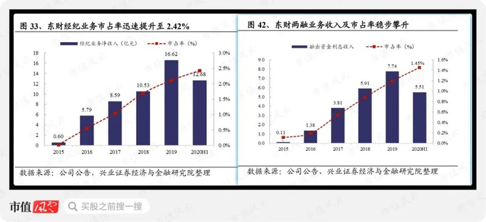 东方财富证券的经纪业务市占率从2016年的0.60%升至2020年中报的2.42%,同期两融市占率从0.2%升至1.45%。