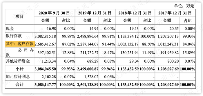 客户的存款(主要来自东方财富证券、天天基金)是货币资金的主要构成,占比高达87%。