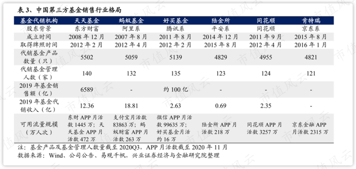 截至2020三季度,天天基金的代销基金管理人数、代销基金产品数量在第三方基金销售公司居榜首,分别为140家、5502只。