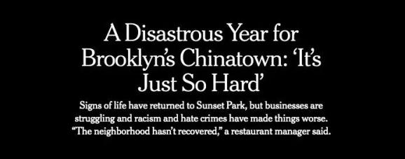 说话的是日落公园金皇廷餐厅的老板陈善庄(John Chan),他也是布鲁克林的华人社区领袖,全美中餐业联盟(纽约)总分会会长。陈先生说,首先是病毒,让他的餐厅销售额大跌了几十万美元。然后就是反亚裔仇恨犯罪的激增,大家感到惶恐不安,更愿意待在家里,远离餐馆,进一步损害了生意。