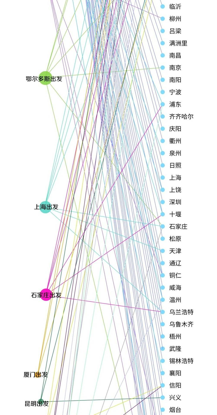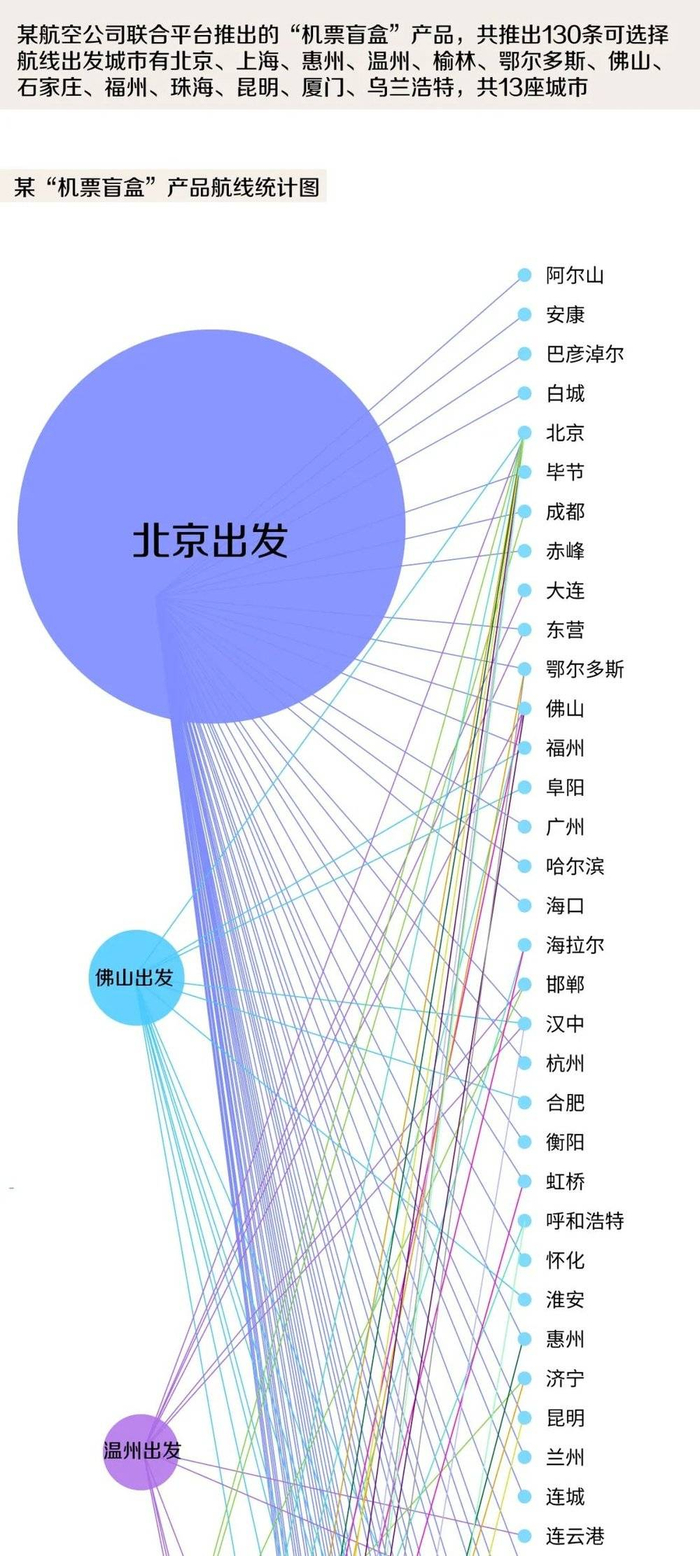 以国内某航空公司4月7日开售的盲盒产品为例,该产品的宣传图中标明了不同始发地所能够匹配到的可选目的地范围,但由于最终所匹配到的目的地具有很大的随机性,所以仍然具有“盲盒”属性。可选的目的地基本上能够涵盖多个城市等级,北京、上海、十堰等目的地出现频率较高,同时也包括白城、毕节、阜阳、济宁等相对小众城市。