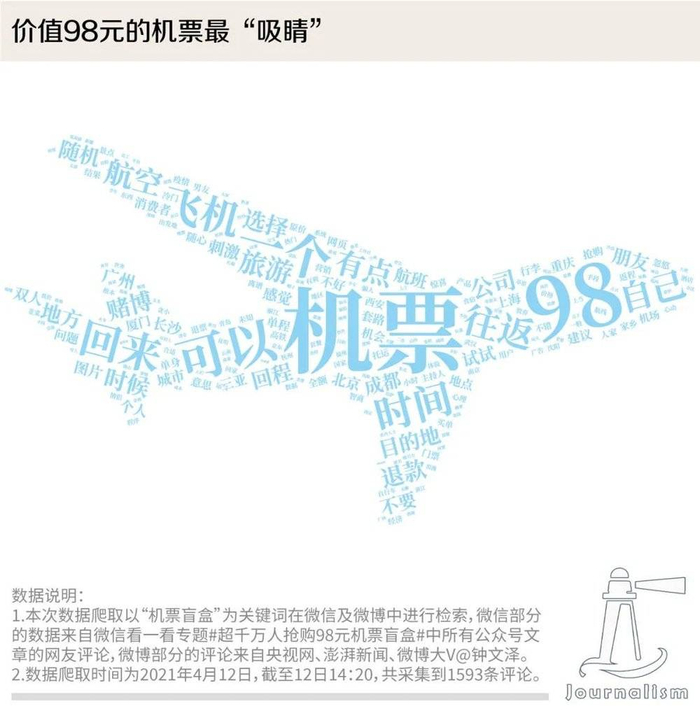 从1593条评论生成的词云图中,可以看到价值98元的机票是引发热议的焦点。机票常常价格不菲,“便宜”似乎很少被用来形容机票。当机票被贴上“便宜”的标签,便成为了吸引消费者尝鲜的一大诱因。除“便宜”之外,“随机”“随心”“刺激”“赌博”是网友对“机票盲盒”较多的形容,“时间”“回程”“目的地”“退款”等名词则显示出网友对机票盲盒规则的关注。