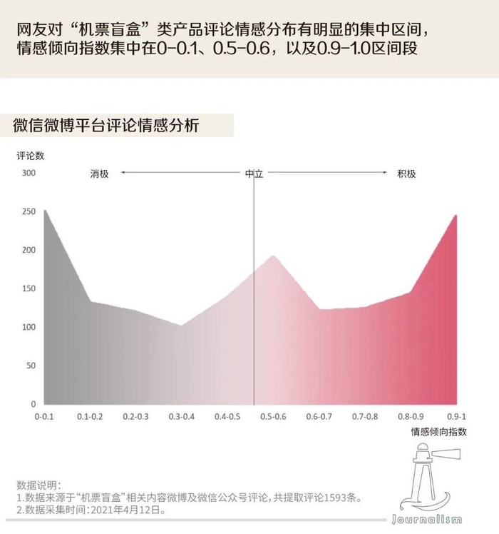 通过对1593条评论数据进行情感分析,我们发现受众反馈的情感指数呈现为“三足鼎立”的状态。网友对机票盲盒类产品的评价有明显的集中区间,情感倾向指数集中在0~0.1、0.5~0.6、0.9~1.0之间(编辑注:情感指数0.5表示中立,情感指数与情感倾向呈正相关)。可见,网友对机票盲盒的反馈不一,分别持积极、消极与中立评价的网友阵营相当。