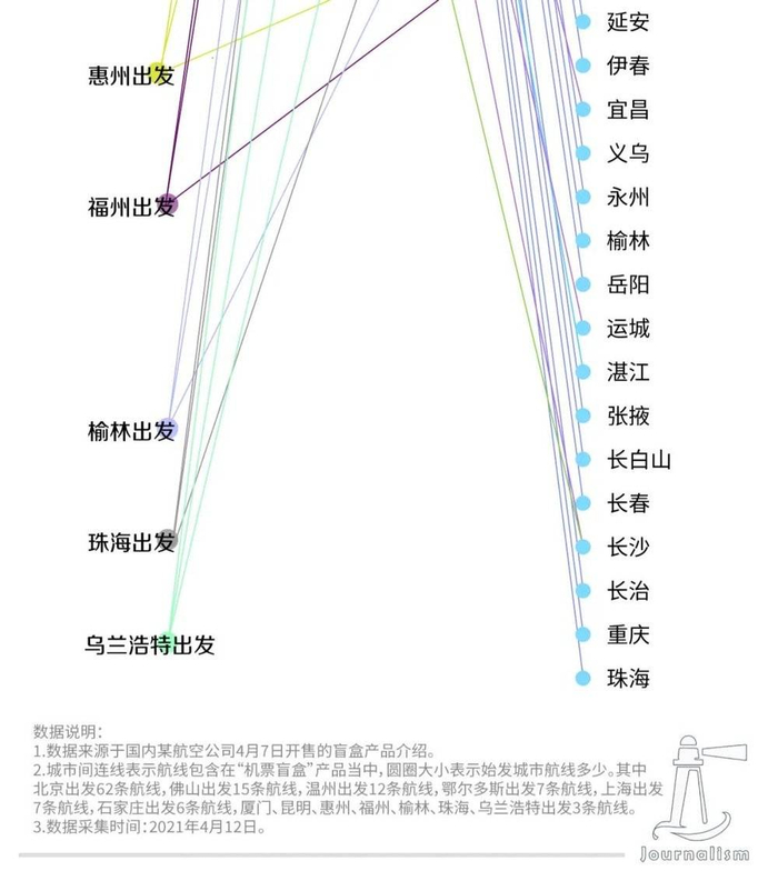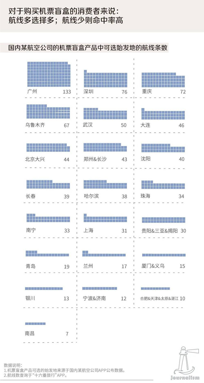 相对而言,官方公布的匹配目的地数量越少,命中率更大;数量越多,则意味着消费者能够有更多选择。而那些未公布目的地范围的“纯盲盒”,则只能通过该航空公司不同始发地的航线条数来推测命中心仪城市的概率。