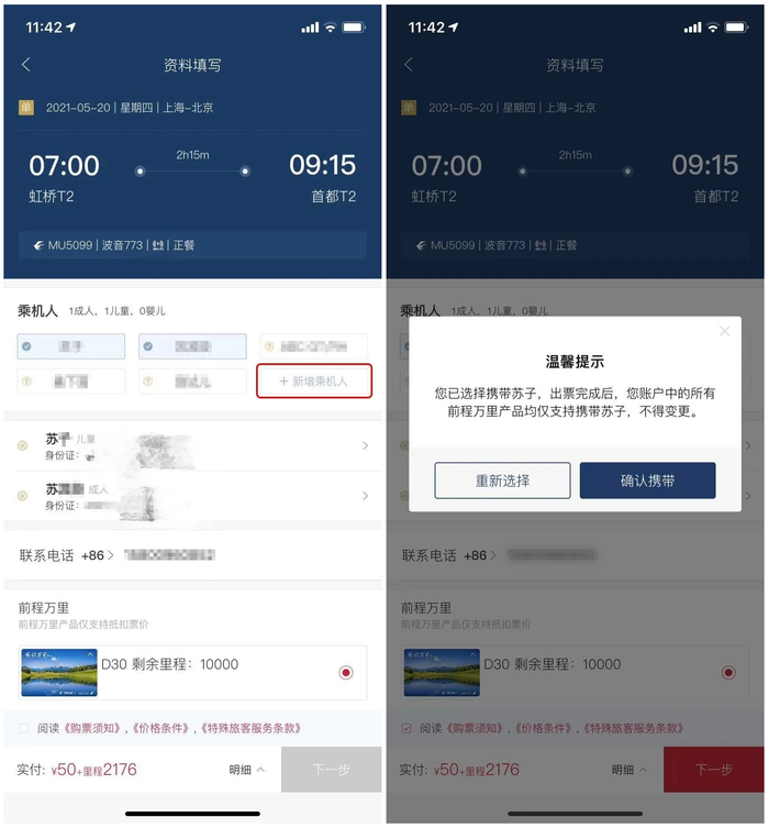 1、请在兑票的订单页面中绑定,新增乘机人,点击“下一步”,确认携带即可(参见下图)