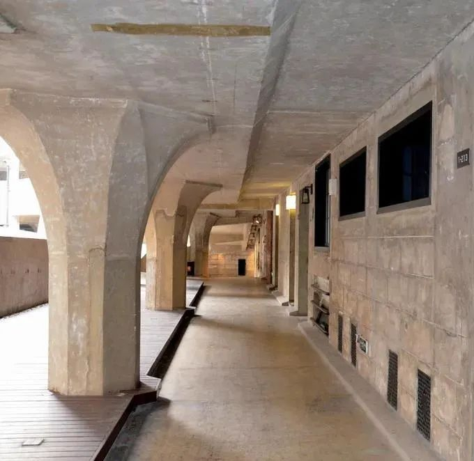 建筑外圈最显眼的细节元素是一根根的“伞柱”。不同于我们平日里常见的圆柱形柱,这里的柱子是伞形的,分八角形和四边形两款,上大下小,带有花纹装饰。整栋楼是无梁楼盖设计,全靠这300根伞柱支撑。