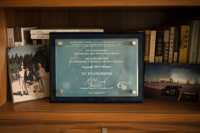 “北极光”杰出文学翻译奖证书 电视机放在许渊冲的卧室。书桌上方悬挂一幅书法,大有来头,“译古今诗词,翻世界名著,创三美理论,饮彤霞晓露。”书架上摆放的多是他和友人的照片,两张黑白照片被放置在白色的木质相框中,一张摄于1949年的巴黎,西南联大的校友在香榭丽舍大街的餐馆设宴欢迎清华校长梅贻琦(左二),左四为许渊冲。对于梅贻琦校长,许渊冲向来敬重。采访中,他回忆说1942在西南联大毕业前,出演德克的英语剧《鞋匠的节日》,“当时我是男主角,梅校长的女儿梅祖彬演我在戏里的夫人。我演的是鞋匠,追求一位女店员(梅祖彬饰演)。梅祖彬身高一米七四,是西南联大个子最高的女生。一开始她还不想和我配戏,结果我和她比,我的身高是一米七五,正好比她高一厘米。”老人哈哈大笑。
