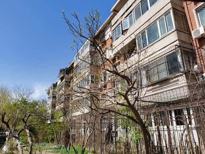 春临北大畅春园。澎湃新闻记者 王诤 摄 春和景明的日子,走进宁静祥和的小区,先就看到路口一株腊梅抽枝发芽,显得满园生机勃勃。小区内没有新楼,五层的红砖楼房一望即知是上个世纪80年代的产物。许渊冲的居所在小区五号楼。2019年时,新东方创始人俞敏洪出资为这里的老楼加装了电梯,免去老师们上下爬楼的辛苦。