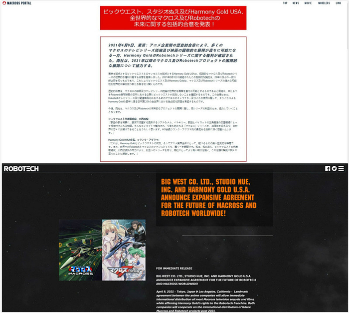 4月9日,位于日本东京的大西公司(ビックウエスト/ Big West),与位于美国加利福尼亚的金和声公司(Harmony Gold USA)达成了里程碑的共识,宣布未来全球的《太空堡垒》和《超时空要塞》扩展协议。双方于3月1日签署了这份扩展协议。这意味着,30多年来,两家围绕着《超时空要塞Macross》与《太空堡垒》之间的利益纠纷基本得到解决。