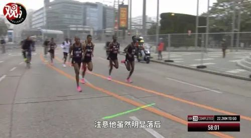 这是基普乔格跑到差不多半程的时候。注意啊,他虽然明显落后,但画面中的黑衣人,其实都是队友。