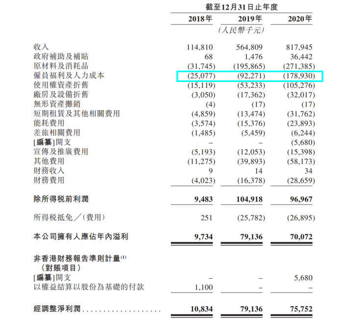 值得注意的是,虽然2020年雇员人数下降,但同时雇员福利及人力成本科目下却分别为2507.7万、9227.1万和1.79亿。