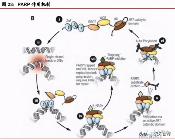 PARP 抑制剂是一种靶向聚 ADP 核糖聚合酶的癌症疗法,通过与 PARP1/2 催化 位点结合导致 PARP 蛋白无法从 DNA 损伤位点上脱落进而导致 DNA 复制叉停 滞,需激发包括 BRCA1/2 等“类 BRCA”蛋白的同源重复修复功能(HRR)进行修 复,当类 BRCA 蛋白受损会导致 HRR 功能失常进而引发导致细胞死亡从而杀灭 肿瘤细胞,具有 BRCA 突变的肿瘤细胞对 PARP 抑制剂敏感度是携带野生型 BRCA 基因的肿瘤细胞的 1000 倍。