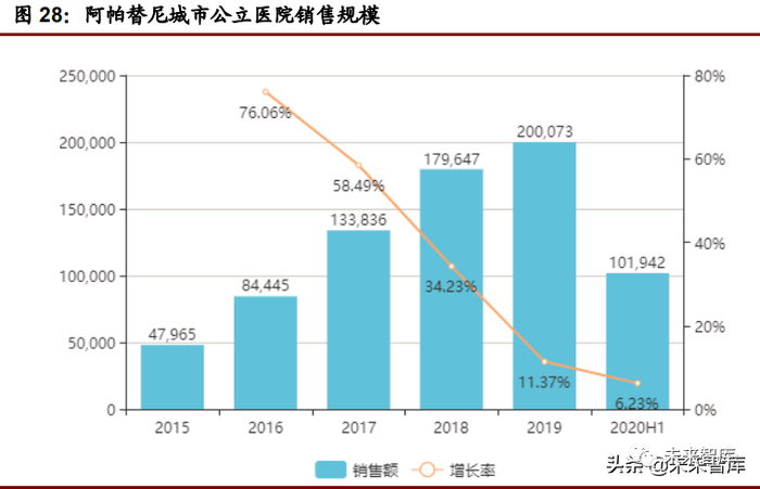 阿帕替尼纳入 2017 年医保目录,价格为 136 元/120mg,2019 年医保谈判续 谈,最新中标价为 115 元/250mg,临床推荐剂量为 850mg/日,用药费用约为 3万元。2020 上半年阿帕替尼销售规模为 10.19 亿元,同比增长 6.23%。