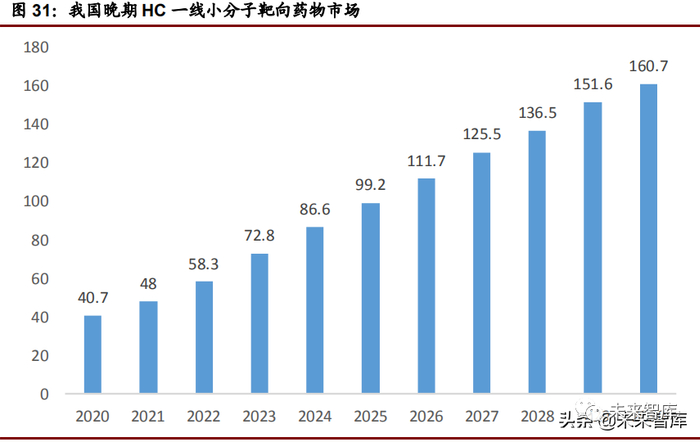 我国治疗 HC 的方法疗效有限,中位无进展生存期不足 10 个月,中位总生存期 仅约一年,亟需更有效的新型的治疗方案。据弗若斯特沙利文数据,2018 年我国 晚期 HCC 一线小分子靶向药市场为 8.1 亿元,可惠及人口渗透率为 4.6%,美国 为 23.3%,据 Frost & Sullivan 数据,随着市场教育推进、患者支付能力提高、 医保对接、新药上市等,预计我国 2030 年渗透率将提升至 43.2%,整体市场规 模将达到 160 亿元。(不考虑索拉非尼纳入集采导致降价与渗透率提升相互作用, 预计将导致晚期 HC 一线靶向药物存量市场降低 10%左右)。