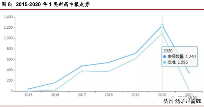 叠加一级市场资本追捧及 IPO 注册制推行,企业新药研发动力持续激活。据药 智数据统计,2020 年 CDE 共受理 1 类创新药受理号 1240 个(其中报临床 1149 个,报生产 48 个),获批准的 1096 个,创历史新高。2019 年 IND 新药数据显 示,抗肿瘤新药在化学创新药、生物创新药均占据绝对数量,我们认为这一趋势延续。
