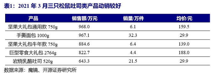 三只松鼠热销产品多为礼包类产品。根据魔镜数据,2021年3月阿里系三只松鼠的TOP3热销产品为坚果大礼包通用款、手撕面包、坚果大礼包牛年款,销售额分别为968.0、967.1、884.6万元。春节过后,吐司类产品动销较好。
