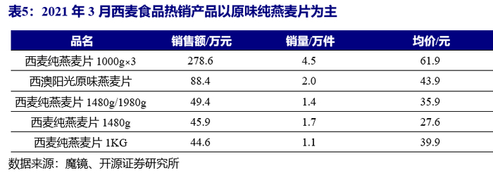 西麦食品热销产品为纯燕麦片,王饱饱热销产品以冷食燕麦片为主。根据魔镜数据,2021年3月阿里系西麦食品的TOP3热销产品分别为西麦纯燕麦片1000g×3、西澳阳光原味燕麦片、西麦纯燕麦片1480g,销售额分别为278.6万元、88.4万元、49.4万元。2021年3月阿里系王饱饱的TOP3热销产品分别为水果坚果酸奶果粒燕麦片、水果坚果燕麦片、咖啡坚果燕麦片,销售额分别为1318万元、283.1万元、270.5万元。西麦食品热销产品以热食纯燕麦为主,而王饱饱热销产品以冷食果味燕麦为主。