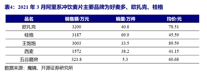 行业集中度略有下降。根据魔镜数据,2021年3月阿里系线上销售额占比前五名分别为好麦多、欧扎克、桂格、王饱饱、智力。燕麦行业CR5上升3.5pct 至40.4%,行业集中度有所上升。