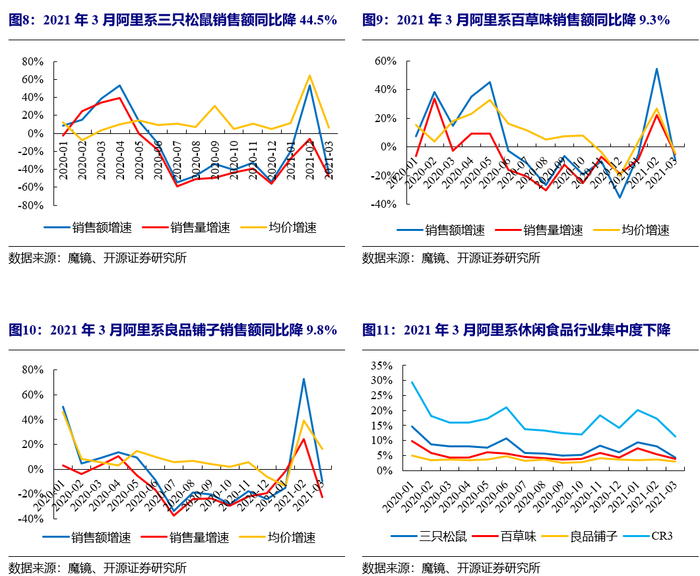 根据魔镜数据,2021年3月阿里系休闲食品行业线上销售额达68.8亿元,同比增2.1%。从龙头表现来看,休闲食品龙头销售额均有下降,三只松鼠、良品铺子销售额下降主要由于销量大幅下降;百草味量价齐跌。从市场份额来看,龙头品牌市场份额均有所降低。休闲食品行业CR3降低5.9 pct至11.3%,行业集中度有所下降。