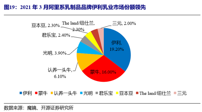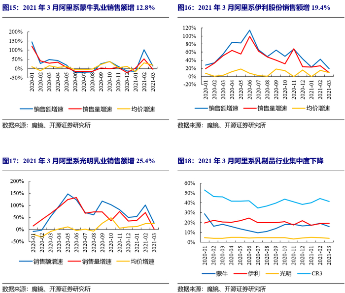 乳制品行业集中度略降。根据魔镜数据,2021年3月阿里系线上销售额占比前三名分别为伊利股份、蒙牛乳业、认养一头牛。伊利股份、蒙牛乳业、光明乳业的市占率分别+0.4、-3.3、-0.9pct至19.2%、16.0%、3.9%。乳制品行业CR3下降2.9pct至41.3%,行业集中度略有下降。