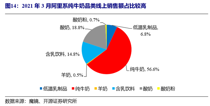 2021年3月乳制品行业销售额持续增长,销量增幅较大。根据魔镜数据,2021年3月阿里系乳制品行业线上销售额达13.6亿元,同比增28.1%。其中,销售量同比增17.7%,销售均价同比增8.8%,行业增长主要由销量增长推动。分子行业来看,2021年3月低温乳制品品类增速最快,同比增76.4%;纯牛奶、羊奶、含乳饮料也稳步增长。乳制品中纯牛奶品类线上销售额占比较高,达56.6%。
