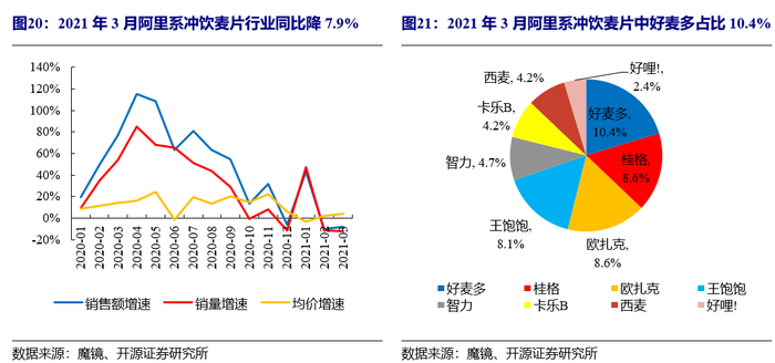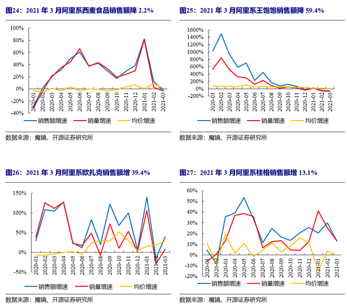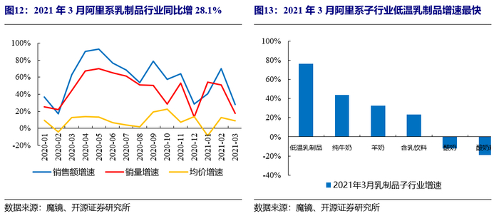饮料冲调行业中:(1)乳制品:阿里系乳制品行业线上销售额达13.6亿元,同比增28.1%。其中,销售量同比增17.7%,销售均价同比增8.8%,行业增长主要由销量提升推动。分子行业来看,2021年3月低温乳制品品类增速最快,同比增76.4%;纯牛奶、羊奶、含乳饮料稳步增长。从龙头表现来看,蒙牛乳业、伊利股份、光明乳业销售额分别同比增长12.8%、19.4%、25.4%,乳制品头部品牌量价齐升。从市占率来看,乳制品行业CR3下降2.9pct至41.3%,行业集中度略有下降。(2)燕麦:2021年3月阿里系冲饮麦片行业线上销售额达3.7亿元,同比降7.9%,主要由销量同比降11.8%导致。从龙头表现来看,桂格、欧扎克销售额增幅较大,分别由销量增长、量价齐升推动。从市场份额来看,燕麦行业CR5上升3.5pct 至40.4%,行业集中度小幅上升。