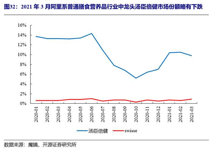 龙头汤臣倍健市场份额略下降。根据魔镜数据,2021年3月阿里系普通膳食营养品行业龙头汤臣倍健市占率下降0.7 pct至9.8%,swisse市占率增长0.3pct至0.9%。