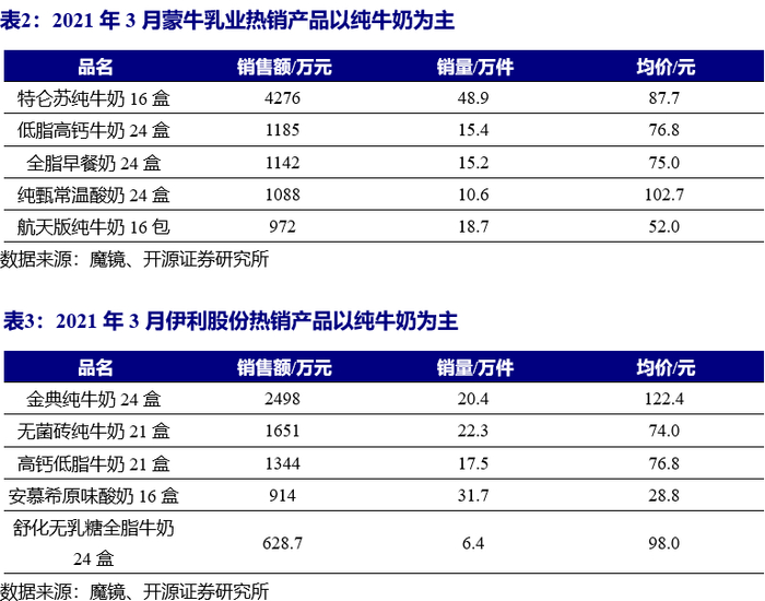 乳制品头部品牌销售额稳步增长。根据魔镜数据,2021年3月蒙牛乳业销售额达2.17亿元,同比增加12.8%,其中销量同比减少4.5%,均价同比增加18.0%;伊利股份销售额达2.60亿元,同比增19.4%,其中销量同比增9.1%,均价同比增9.4%,销售额增长主要由销量及均价共同提升推动;光明乳业销售额达5278万元,同比增25.4%,其中销量同比增1.0%,均价同比增24.2%。伊利股份、光明乳业量价齐升,蒙牛乳业增长主要由均价提升带动。